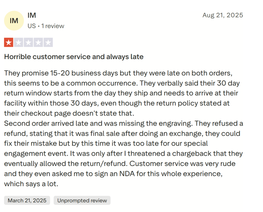 Brilliance.com has 4.9 stars on Trustpilot, with many customers praising its attentive customer service, quick responses, and a smooth buying experience. However, if you dig a bit deeper, their negative reviews seem somewhat alarming. For example, several negative reviews report long wait times, lack of, or, in some cases, even unpleasant communication, and problems getting a refund.