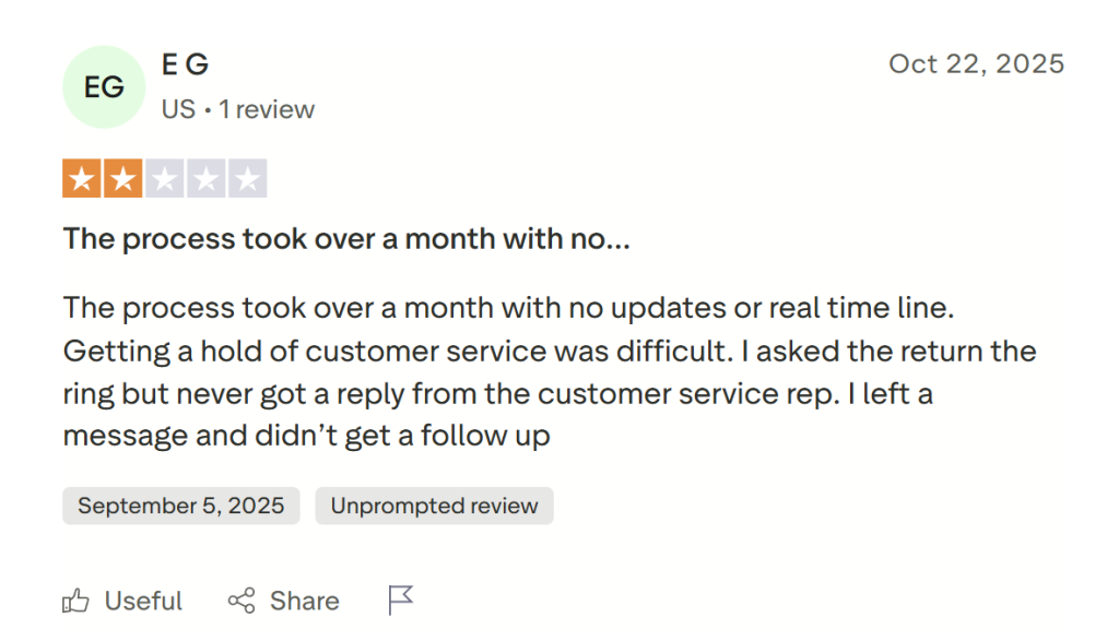 There aren’t many discussions about Brilliance.com on Reddit, especially compared to the overwhelmingly positive reviews we found on Trustpilot. While some Reddit users share great experiences and satisfaction with their purchases, others report long wait times with orders stuck in the “polishing and setting” stage for weeks, as well as frustrating communication with customer service.