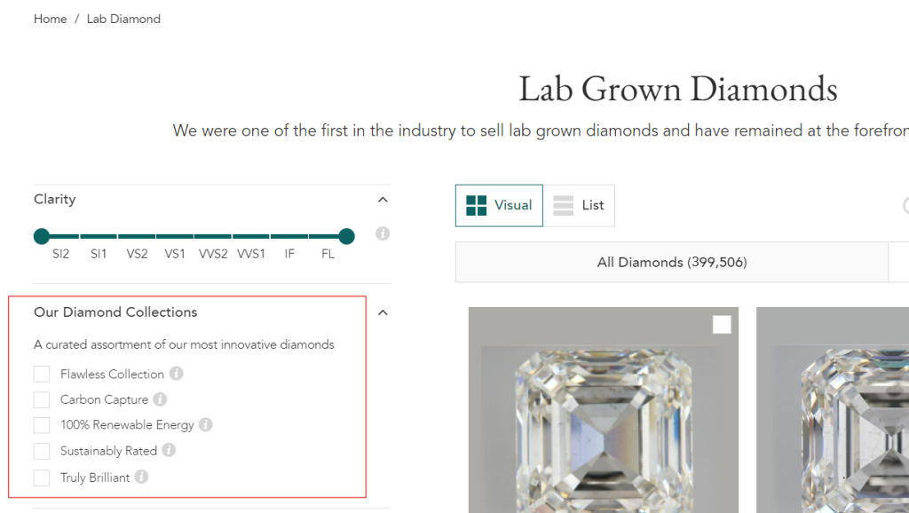 But more importantly, Brilliant Earth sells lab-grown diamonds graded sustainably and produced using sustainable energy sources while following specific guidelines. While the selection is still somewhat limited, it is at the same level as other sustainable diamond industry leaders, such as Vrai.